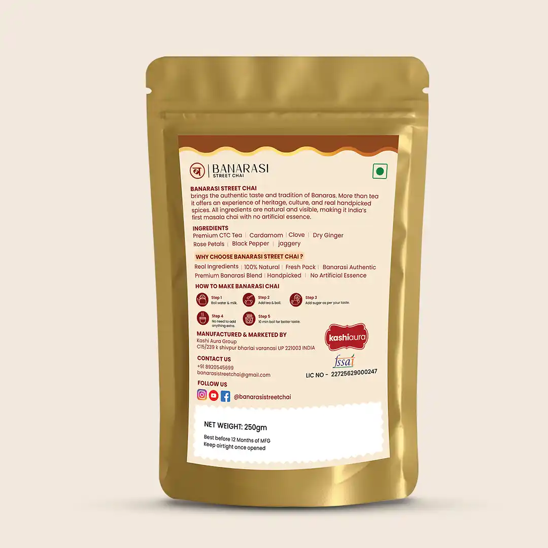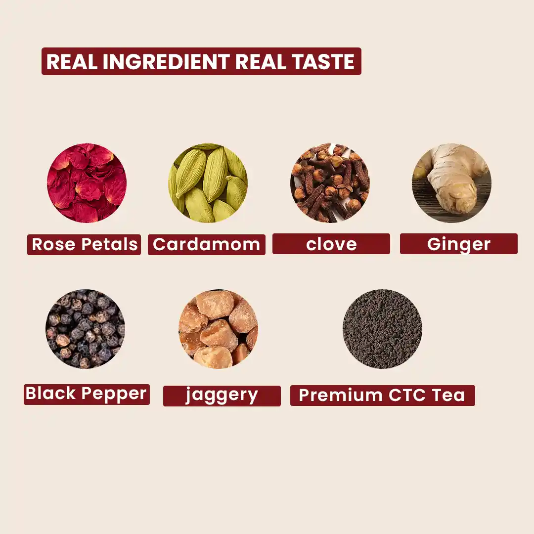 This premium masala chai is made using high-quality CTC tea blended with natural spices like cardamom, clove, dry ginger, black pepper, rose petals, and jaggery.